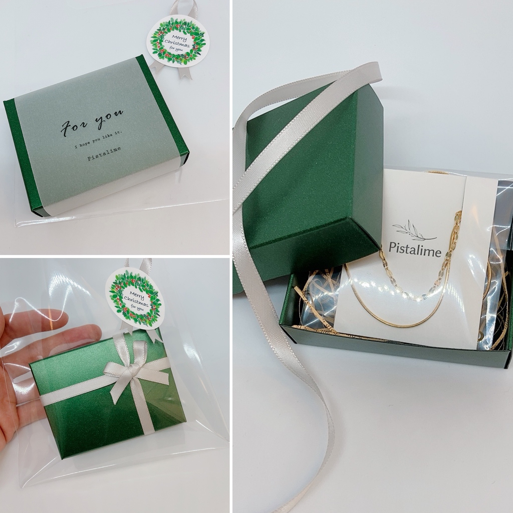 アクセサリーをお届けするボックスは、クリスマスにぴったりのグリーンのボックスに変わります♪